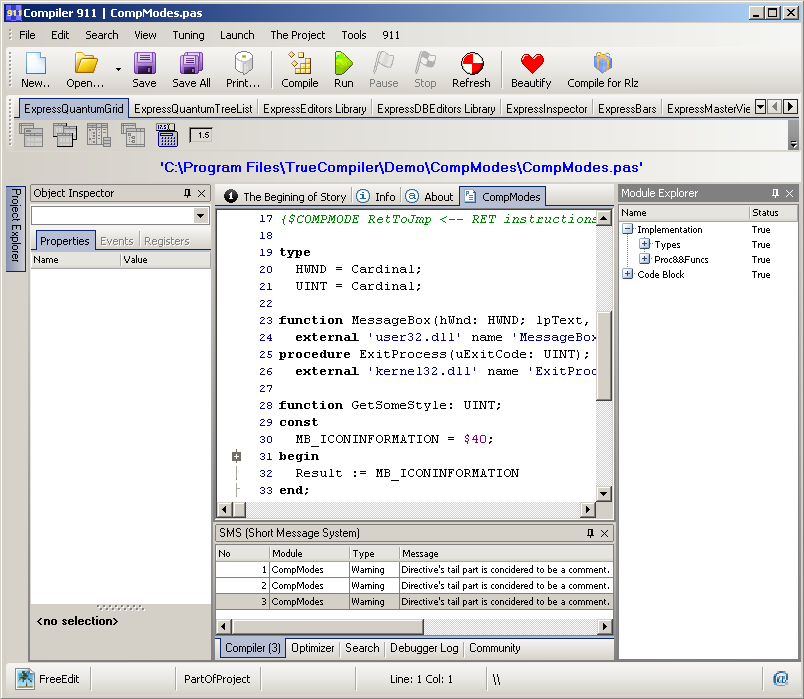 True Compiler, appelé précédemment Compiler911, est un environnement de développement complet, gratuit, fonctionnant sous Windows, permettant de compiler de l'Object Pascal et de l'Assembleur. La particularité de True Compiler est de permettre de créer du code pour un noyau de système d'exploitation ou, par exemple, un secteur de boot incluant du code 16 bits et du code 32 bits.