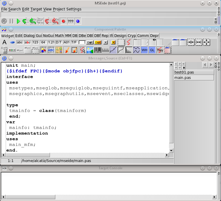 MSEide+MSEgui est un outil de programmation visuelle qui, à l'instar du célèbre Delphi de Borland, est en langage Pascal. Licence GNU oblige, le compilateur employé ici est le FreePascal. Particularité très intéressante, la compilation des programmes se fait aussi bien sous Windows que sous Linux, en gardant le même résultat visuel sous les deux OS. L'astuce a consisté à construire une bibliothèque graphique portable sur les deux systèmes en utilisant les primitives de plus bas niveau possible de ces deux systèmes : Win32 pour Windows et X11 pour Linux.