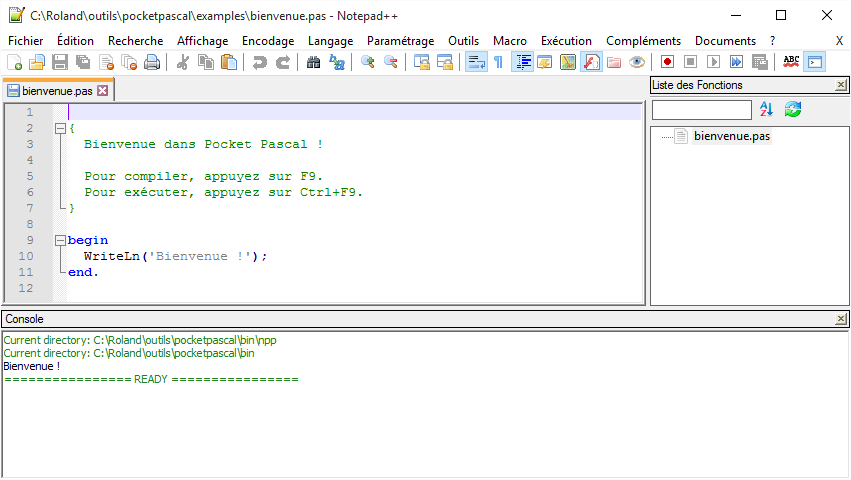 Pocket Pascal est un paquetage réunissant le compilateur Free Pascal et l'éditeur de texte Notepad++.