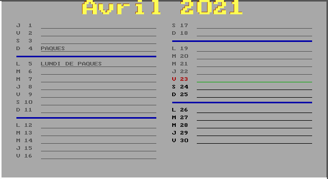 Programme qui affiche le calendrier de l'année courante (y compris les fêtes catholiques mobiles), et éventuellement des années précédentes ou suivantes.